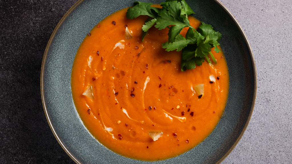 Una entrada reconfortante y llena de color. La calabaza asada resalta su sabor natural y ligeramente dulce, mientras que la textura cremosa se logra sin necesidad de cremas pesadas. Rica en fibra, betacarotenos y antioxidantes, esta receta favorece la saciedad y contribuye a mantener estables los niveles de glucosa. Ideal para acompañar tus cenas de invierno con un toque nutritivo y elegante.